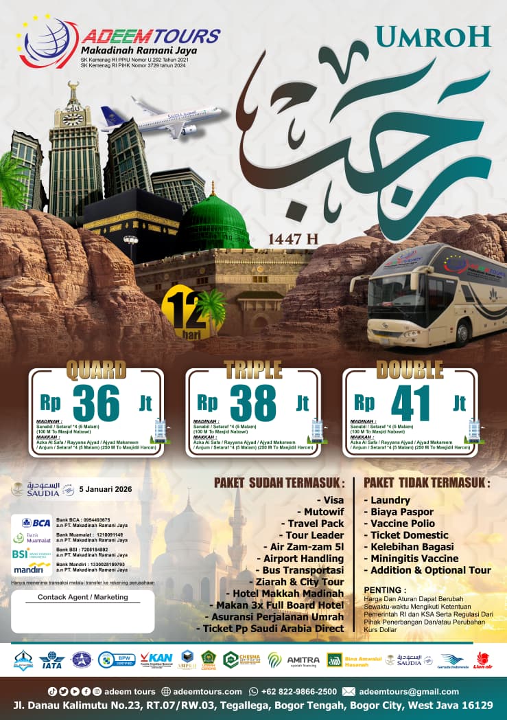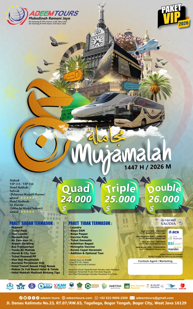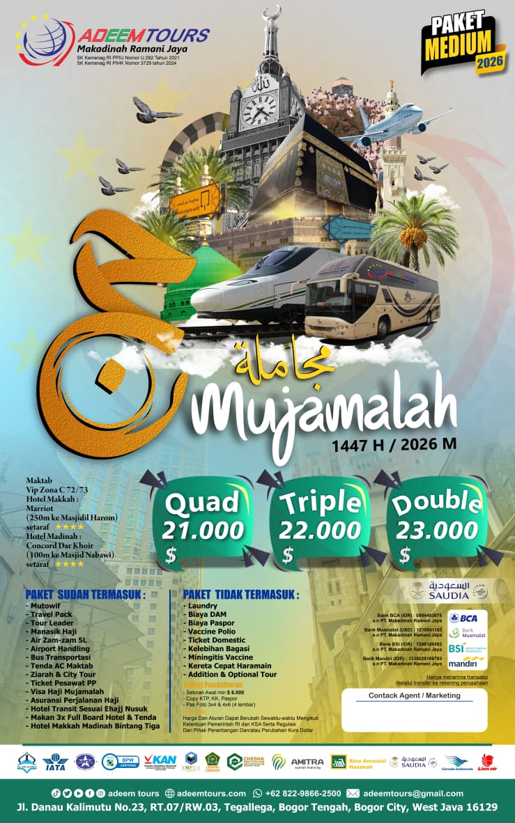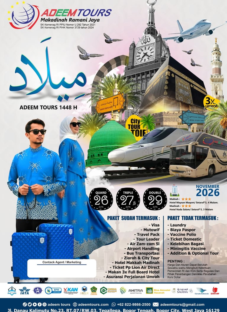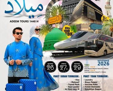 Adeem Tours adalah penyelenggara perjalanan haji dan umrah resmi sejak 2015, berkomitmen pada kualitas dan kenyamanan jamaah.